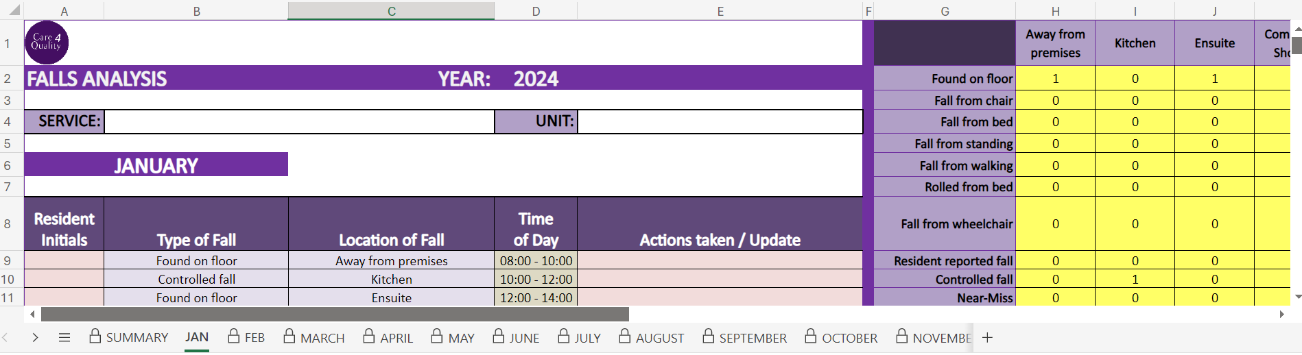 Our tracker is designed specifically for CQC registered services, empowering administrators and caregivers to take a proactive approach in reducing and preventing falls among service users. This product goes beyond incident tracking, providing a comprehensive falls analysis and trends tool that enables services to identify patterns in order to implement targeted interventions, achieve compliance and continuously improve resident safety. This tool can support you to elevate your service’s falls prevention strategy, reduce risks, achieve compliance and foster a culture of continuous improvement.