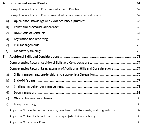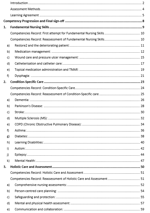 Our competencies support Fundamental Nursing Skills and Condition-Specific Care, alongside Holistic Care and Professional Practice. They are designed to be thorough, addressing competencies under 3 areas: Knowledge Assessment, and Response. The workbook is customisable to your service.