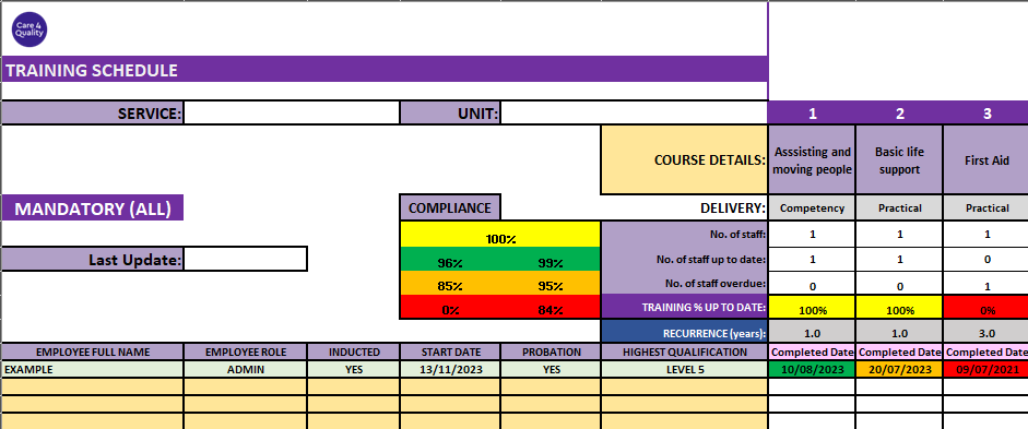 We have developed a training matrix that allows you to capture detail of customisable mandatory training with an oversight report, and role-specific training monitoring, also monitor if employee induction and probation has been completed. The overview sheet calculates the percentage of mandatory training compliance across the whole home while the mandatory and role-specific records present training % compliance per course, and highlights who will be due a refresher within the next 30 days!