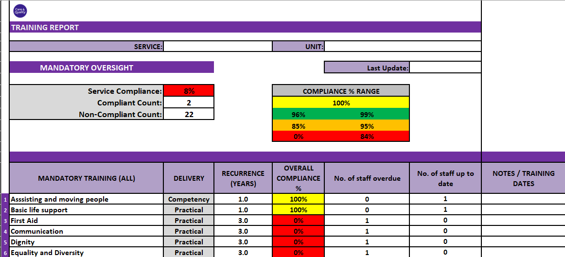 This tool will give you an effective overview of training compliance and perfect for enhancing your internal audits, organisational oversight, and compliance for Safe and Effective Staffing and support